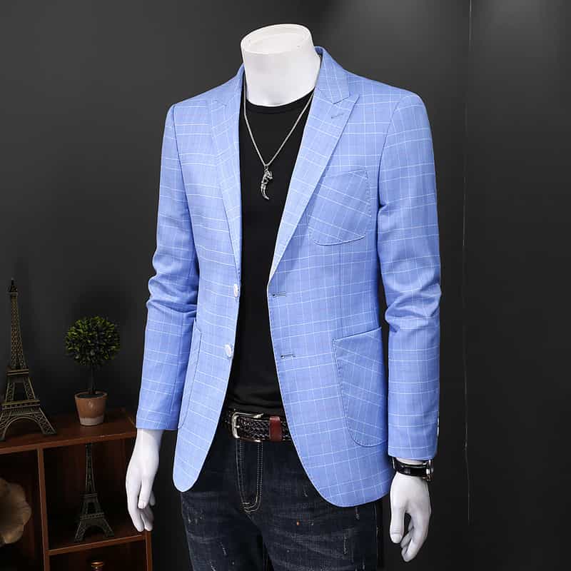 Men's Blazer Slim Fit One Button Suit Jacket Light Blue Plaid Sports Coat
